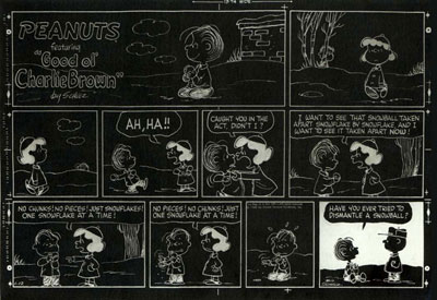 These RARE Paper Negative Prints are the original contact Negatives for the original Strips as drawn by Charles M. Schulz, all dating back to his classic period; 1968, 1969 and 1970. After the completion of each Peanuts Strip, Paper Negative Prints were made, and with these Negatives they made Positive Photostats which were distributed to Newspapers throughout the World. The first Paper Negative process was actually created by William Talbot back in the 1830's. The Metropolitan Museum of Art in NYC had an exhibit of Talbot's Negative Prints "Impressed by Light: British Photographs from Paper Negatives, 1840-1860" "There is nothing quite like the earliest stages, when the paper negative itself took on a look and feel that made the 19th century photography community want to exhibit the negatives themselves--and they often did." In 1973 Charles Schulz (Creative Associates) sent the following Negative Prints to Gene Persson, co-producer of the hit musical YOU'RE A GOOD MAN, CHARLIE BROWN, to be used as source material for the development of a new PEANUTS stage musical. SNOOPY! THE MUSICAL premiered on December 9, 1975 at the Little Fox Theatre in San Francisco, California. NEGATIVE PRINT DIMENSIONS: 14 1/2" X 10 1/4" Negative Prints come with a FREE matching positive Photostat Print. Click on link: FRAMED NEGATIVE PRINT Click the Negative Print for larger images and more info! |