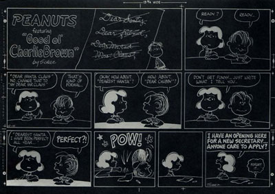 These RARE Paper Negative Prints are the original contact Negatives for the original Strips as drawn by Charles M. Schulz, all dating back to his classic period; 1968, 1969 and 1970. After the completion of each Peanuts Strip, Paper Negative Prints were made, and with these Negatives they made Positive Photostats which were distributed to Newspapers throughout the World. The first Paper Negative process was actually created by William Talbot back in the 1830's. The Metropolitan Museum of Art in NYC had an exhibit of Talbot's Negative Prints "Impressed by Light: British Photographs from Paper Negatives, 1840-1860" "There is nothing quite like the earliest stages, when the paper negative itself took on a look and feel that made the 19th century photography community want to exhibit the negatives themselves--and they often did." In 1973 Charles Schulz (Creative Associates) sent the following Negative Prints to Gene Persson, co-producer of the hit musical YOU'RE A GOOD MAN, CHARLIE BROWN, to be used as source material for the development of a new PEANUTS stage musical. SNOOPY! THE MUSICAL premiered on December 9, 1975 at the Little Fox Theatre in San Francisco, California. NEGATIVE PRINT DIMENSIONS: 14 1/2" X 10 1/4" Negative Prints come with a FREE matching positive Photostat Print. Click on link: FRAMED NEGATIVE PRINT Click the Negative Print for larger images and more info! |
