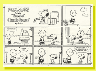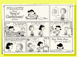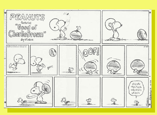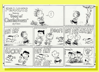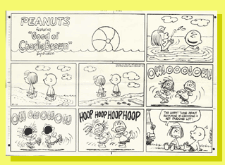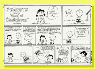 Peanuts Comic Strips by Charles Schulz Original SUNDAY PHOTOSTATS (Photostats are photographic copies of the original strips, which were sent to newspapers prior to publishing.) All produced in 1971. 1972 and 1973 In 1973 United Features Syndicate sent these Sunday Photostats to Gene Persson, co-producer of the hit musical YOU'RE A GOOD MAN, CHARLIE BROWN, to be used as source material for the development of a new PEANUTS stage musical. SNOOPY! THE MUSICAL premiered on December 9, 1975 at the Little Fox Theatre in San Francisco, California. Dimensions: 14" X 10" FRAMED PRICE: $375.00 Framed in black solid wood, acid free mat, plexiglas w/signed Certificate of Authenticity. Domestic FedEx shipping/handling/insurance $25.00 |