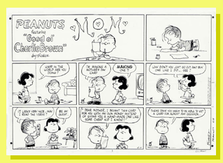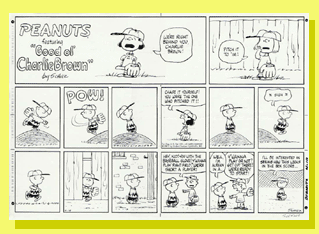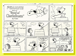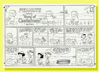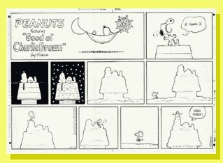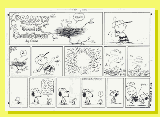 Peanuts Comic Strips by Charles Schulz Original SUNDAY PHOTOSTATS (Photostats are photographic copies of the original strips, which were sent to newspapers prior to publishing.) All produced in 1971. 1972 and 1973 In 1973 United Features Syndicate sent these Sunday Photostats to Gene Persson, co-producer of the hit musical YOU'RE A GOOD MAN, CHARLIE BROWN, to be used as source material for the development of a new PEANUTS stage musical. SNOOPY! THE MUSICAL premiered on December 9, 1975 at the Little Fox Theatre in San Francisco, California. Dimensions: 14" X 10" FRAMED PRICE: $375.00 Framed in black solid wood, acid free mat, plexiglas w/signed Certificate of Authenticity. Domestic FedEx shipping/handling/insurance $25.00 |