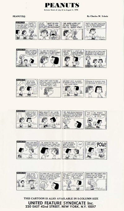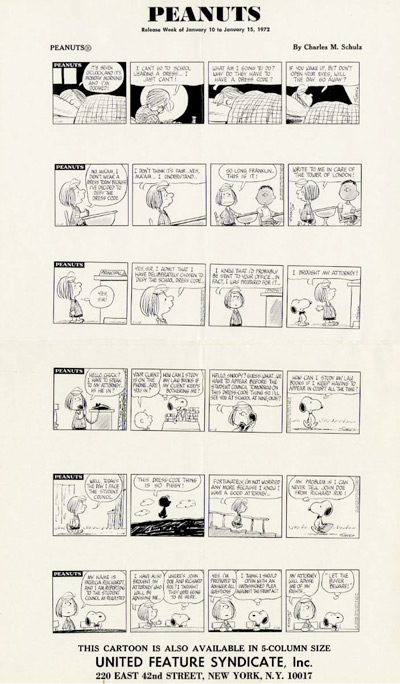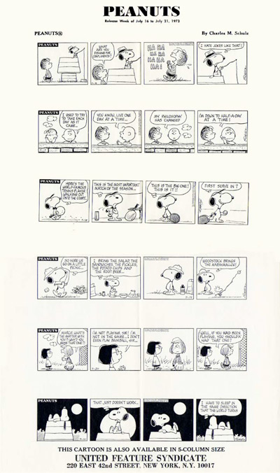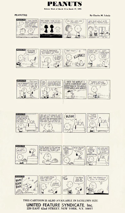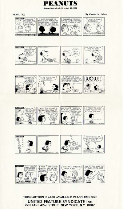Peanuts Comic Strips by Charles Schulz Original DAILY PHOTOSTATS 6 Daily Strips published in 1972 and 1973 In 1973 United Features Syndicate sent these Daily Printer's Proofs to Gene Persson, co-producer of the hit musical YOU'RE A GOOD MAN, CHARLIE BROWN, to be used as source material for the development of a new PEANUTS stage musical. SNOOPY! THE MUSICAL premiered on December 9, 1975 at the Little Fox Theatre in San Francisco, California. Dimensions: 17 1/2" X 10" FRAMED PRICE: $375.00 Framed in black solid wood, acid free mat, plexiglas w/signed Certificate of Authenticity mounted on back. Domestic shipping included! |