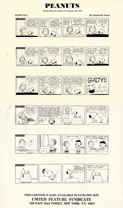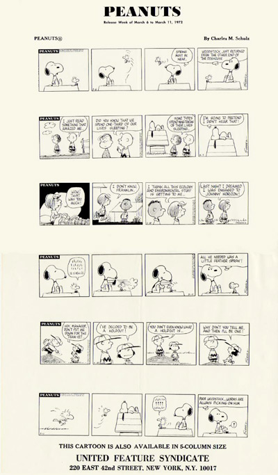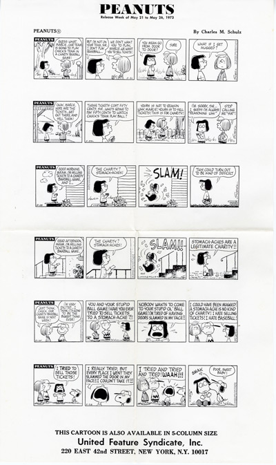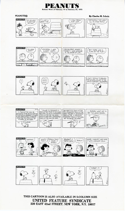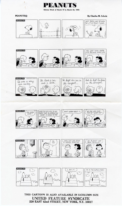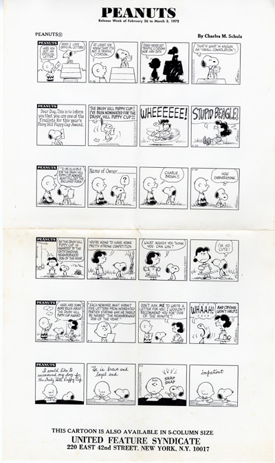 Peanuts Comic Strips by Charles Schulz Original DAILY PHOTOSTATS 6 Daily Strips published in 1972 and 1973 In 1973 United Features Syndicate sent these Daily Printer's Proofs to Gene Persson, co-producer of the hit musical YOU'RE A GOOD MAN, CHARLIE BROWN, to be used as source material for the development of a new PEANUTS stage musical. SNOOPY! THE MUSICAL premiered on December 9, 1975 at the Little Fox Theatre in San Francisco, California. Dimensions: 17 1/2" X 10" FRAMED PRICE: $375.00 Framed in black solid wood, acid free mat, plexiglas w/signed Certificate of Authenticity mounted on back. Domestic FedEx shipping/handling/insurance $25.00 |