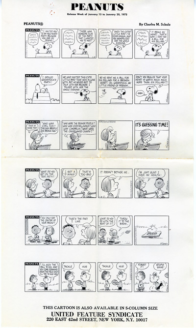 Peanuts Comic Strips by Charles Schulz Original DAILY PHOTOSTATS 6 Daily Strips published in 1972 and 1973 In 1973 United Features Syndicate sent these Daily Printer's Proofs to Gene Persson, co-producer of the hit musical YOU'RE A GOOD MAN, CHARLIE BROWN, to be used as source material for the development of a new PEANUTS stage musical. SNOOPY! THE MUSICAL premiered on December 9, 1975 at the Little Fox Theatre in San Francisco, California. Dimensions: 17 1/2" X 10" FRAMED PRICE: $375.00 Framed in black solid wood, acid free mat, plexiglas w/signed Certificate of Authenticity mounted on back. Domestic shipping included! |