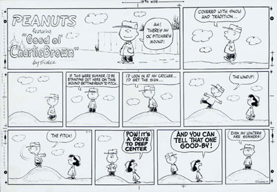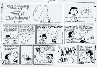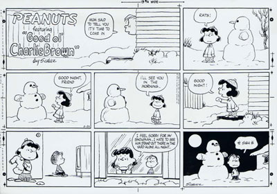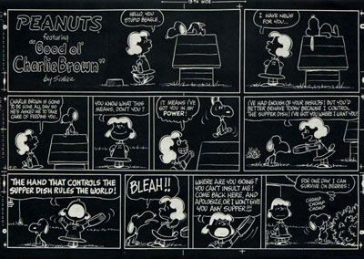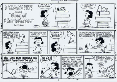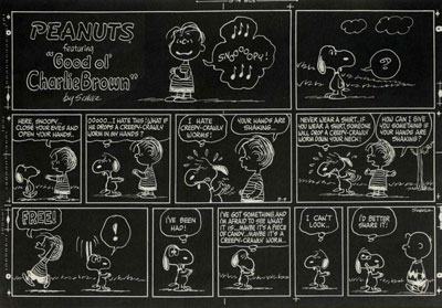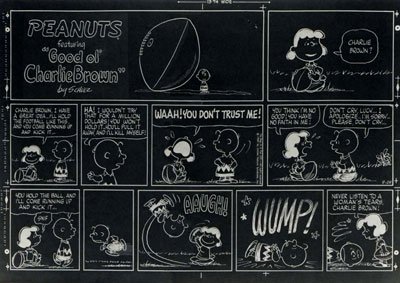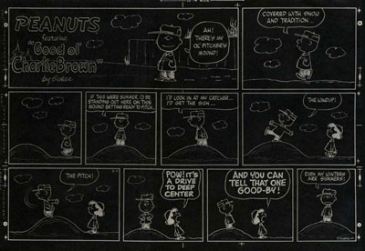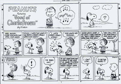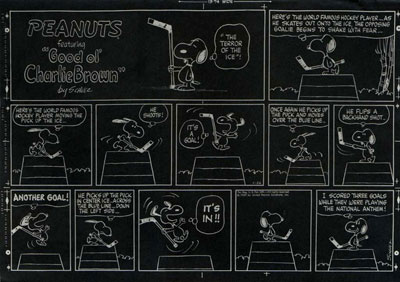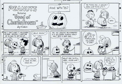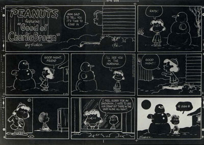 These RARE Paper Negative Prints are the original contact Negatives for the original Strips as drawn by Charles M. Schulz, all dating back to his classic period; 1968, 1969 and 1970. After the completion of each Peanuts Strip, Paper Negative Prints were made, and with these Negatives they made Positive Photostats which were distributed to Newspapers throughout the World. The first Paper Negative process was actually created by William Talbot back in the 1830's. The Metropolitan Museum of Art in NYC had an exhibit of Talbot's Negative Prints "Impressed by Light: British Photographs from Paper Negatives, 1840-1860" "There is nothing quite like the earliest stages, when the paper negative itself took on a look and feel that made the 19th century photography community want to exhibit the negatives themselves--and they often did." In 1973 Charles Schulz (Creative Associates) sent the following Negative Prints to Gene Persson, co-producer of the hit musical YOU'RE A GOOD MAN, CHARLIE BROWN, to be used as source material for the development of a new PEANUTS stage musical. SNOOPY! THE MUSICAL premiered on December 9, 1975 at the Little Fox Theatre in San Francisco, California. NEGATIVE PRINT DIMENSIONS: 14 1/2" X 10 1/4" Negative Prints come with a FREE matching positive Photostat Print. Click on link: FRAMED NEGATIVE PRINT Click the Negative Print for larger images and more info! |